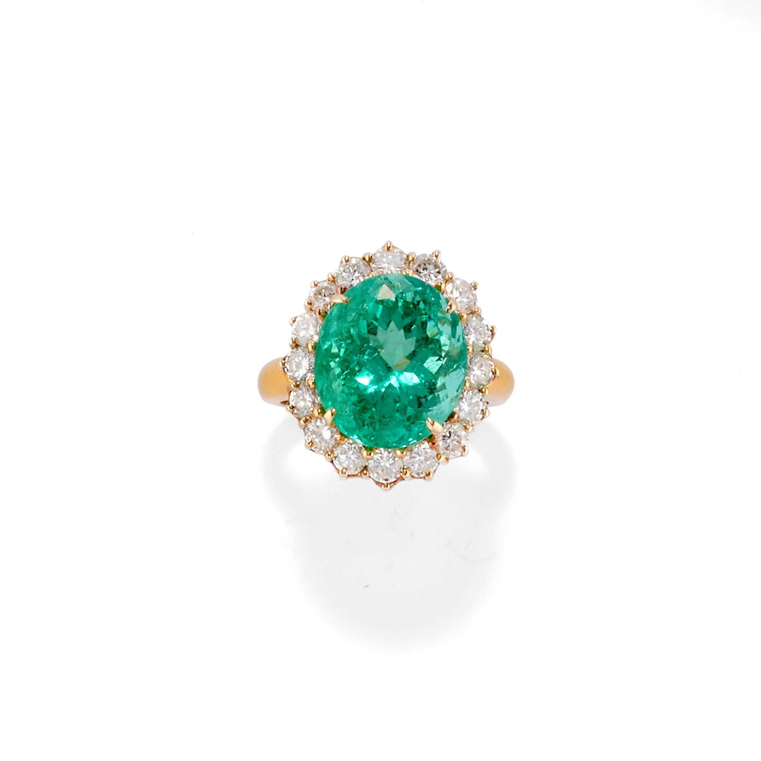 al centro smeraldo Colombia taglio ovale di ct 9,23, contorno in diamanti taglio brillante per totale ct 1,60 circa, colore G/H, purezza VVS.