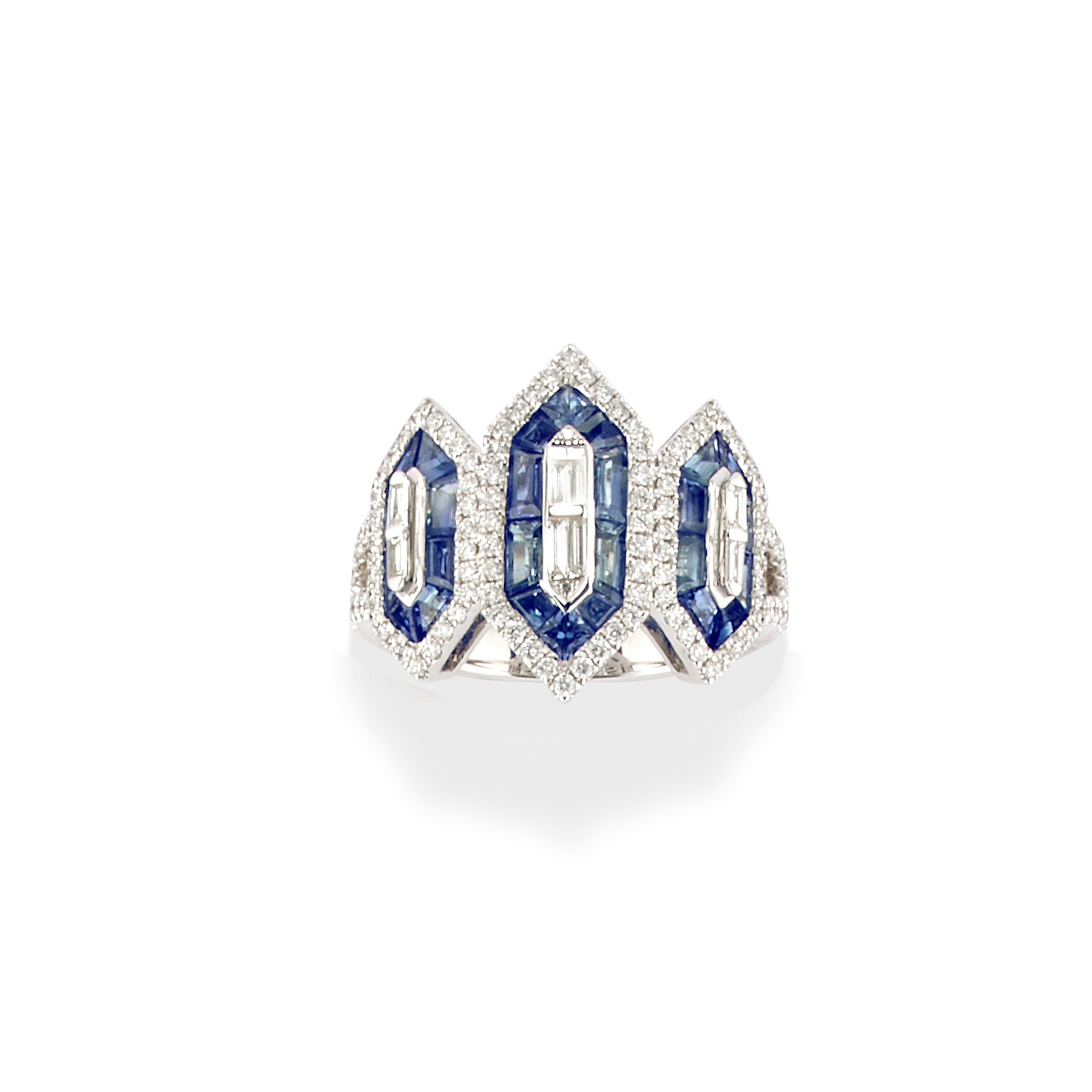 sommità geometrica con zaffiri taglio fantasia per totale ct 2,50 circa e diamanti taglio brillante e baguette per totale ct 0,80 circa.