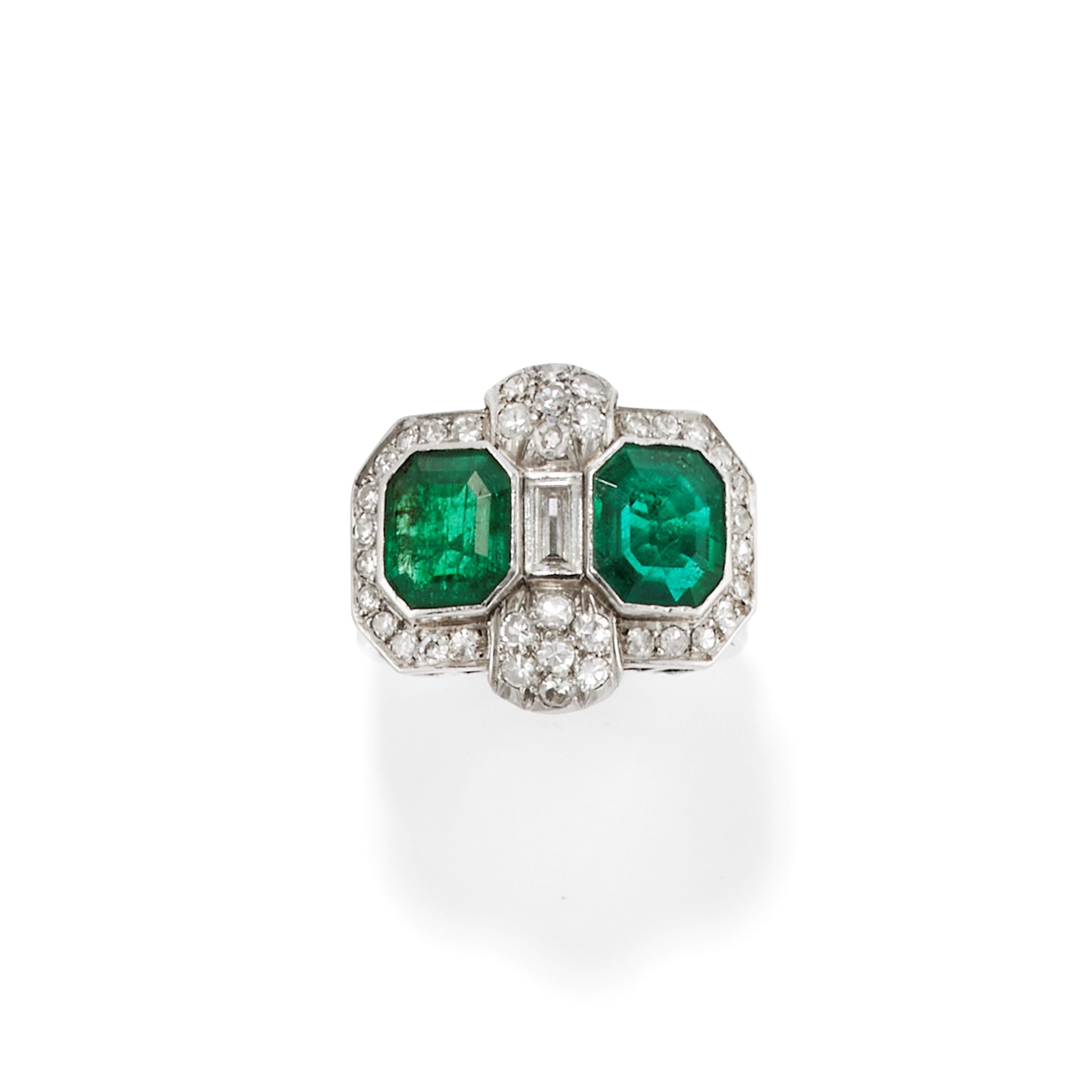 al centro due smeraldi Colombia taglio rettangolare a contorno ottagonale per totale ct 3,00 circa, contorno in diamanti taglio huit-huit e baguette per totale ct 1,15 circa.