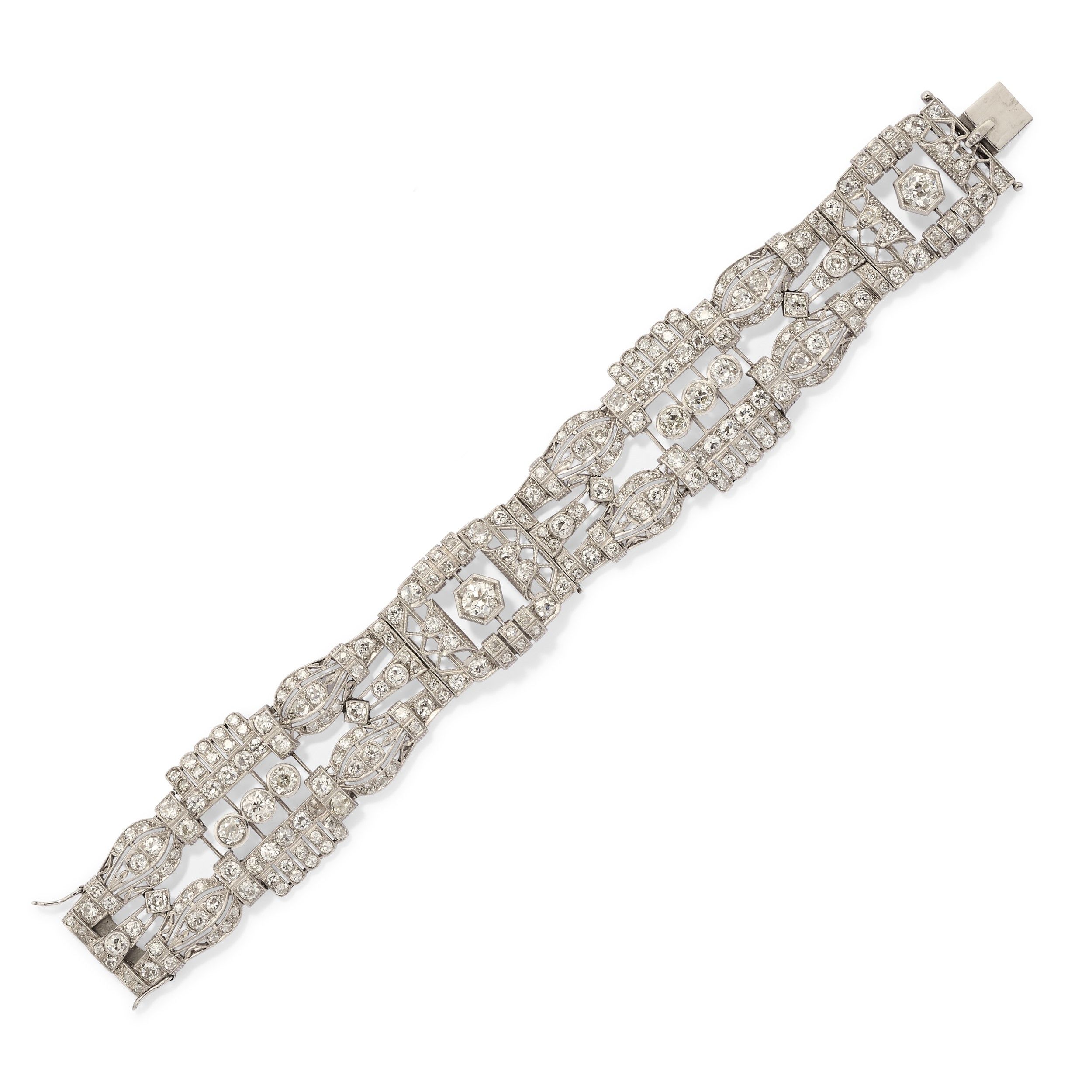 1925 circa realizzato con settori geometrici traforati in diamanti taglio vecchio per totale ct 15,00 circa, con decoro a milligrano.