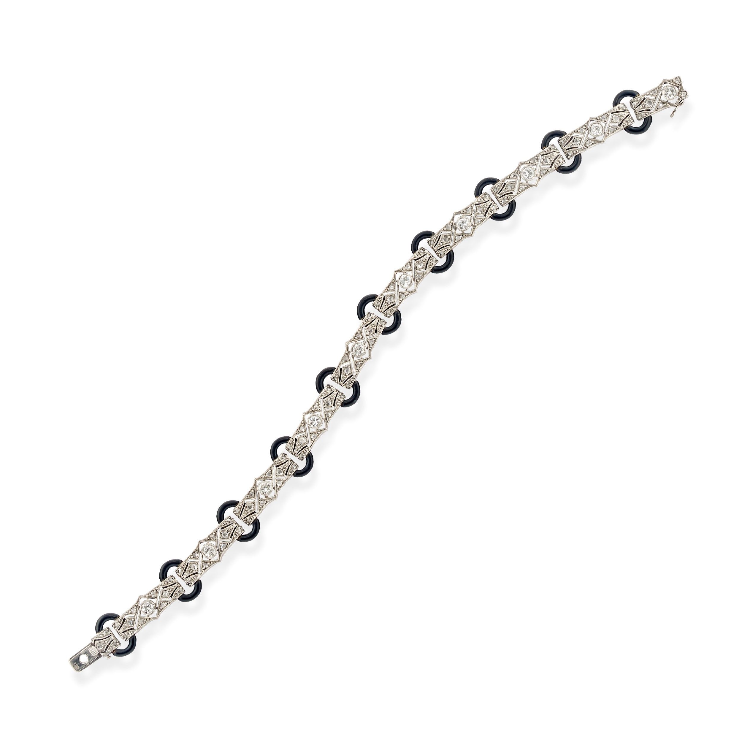 1930 circa a settori impreziositi da diamanti taglio rosa e vecchio intervallati da maglie ovali in onice, decoro a milligrano.