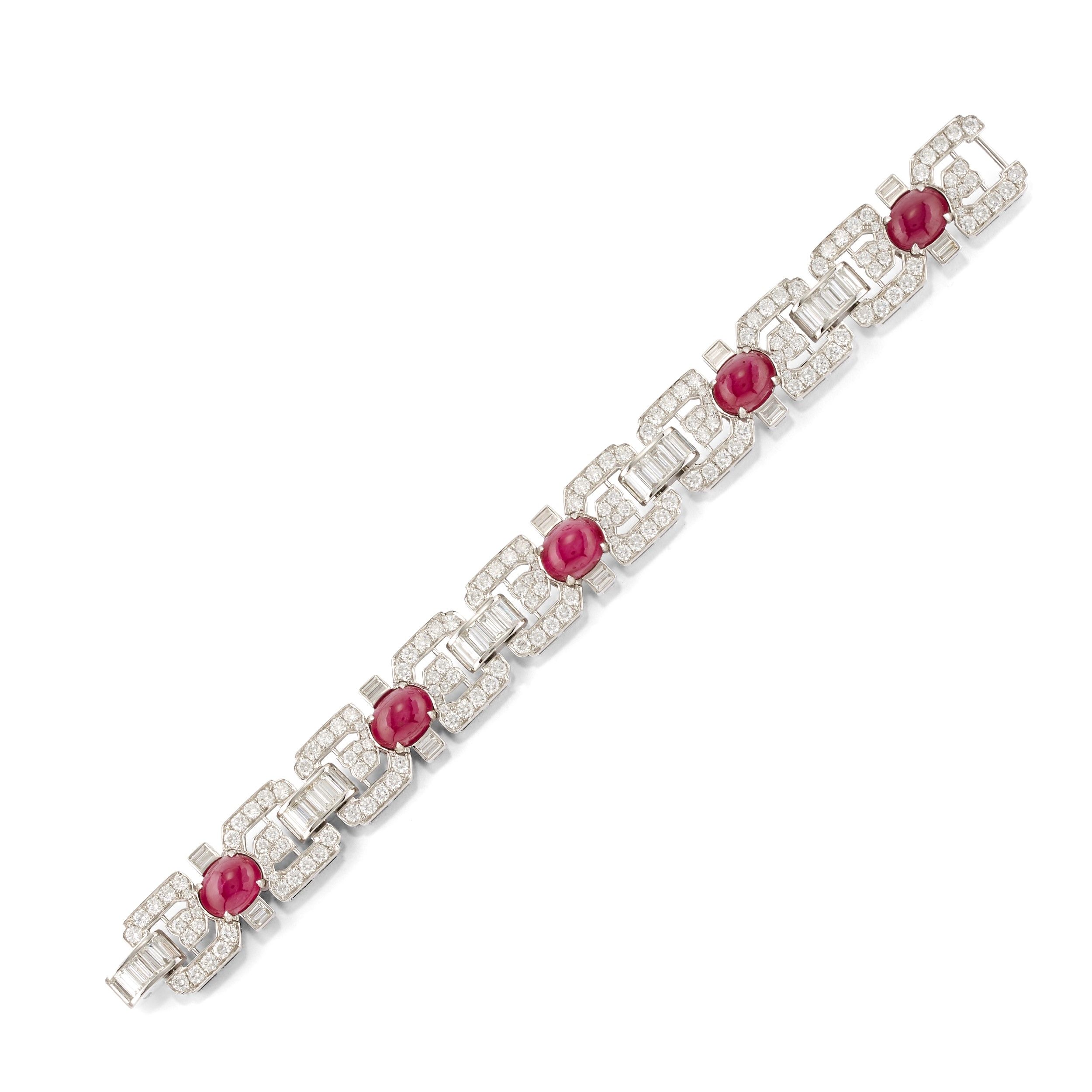 a maglie con settori incernierati, rubini taglio ovale cabochon pet totale ct 20,00 circa e diamanti taglio brillante e baguette per totale ct 11,00 circa.