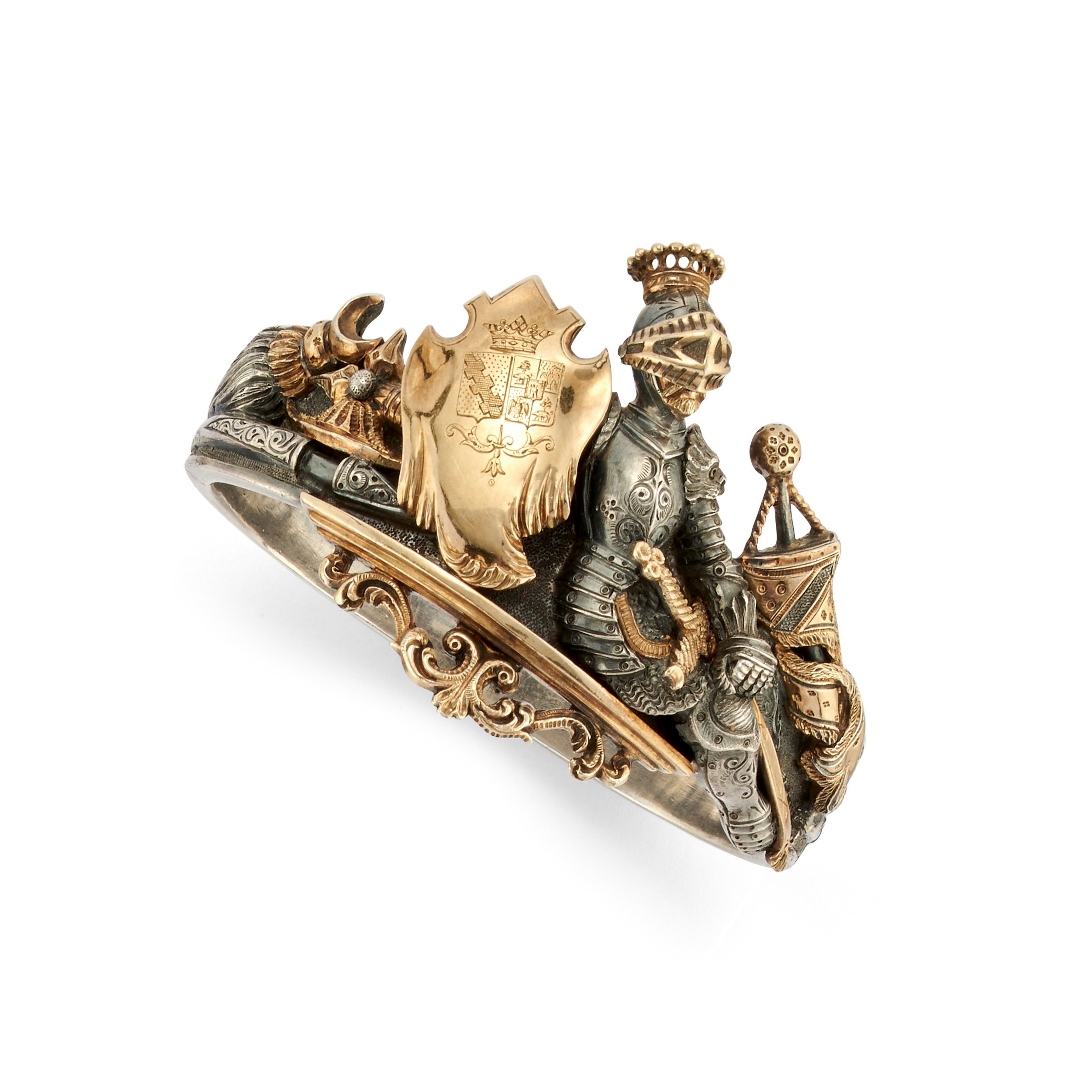 XIX secolo spilla con corona comitale e bracciale con corona marchionale e soldato, con applicazioni vegetali e decori eseguiti a bulino.