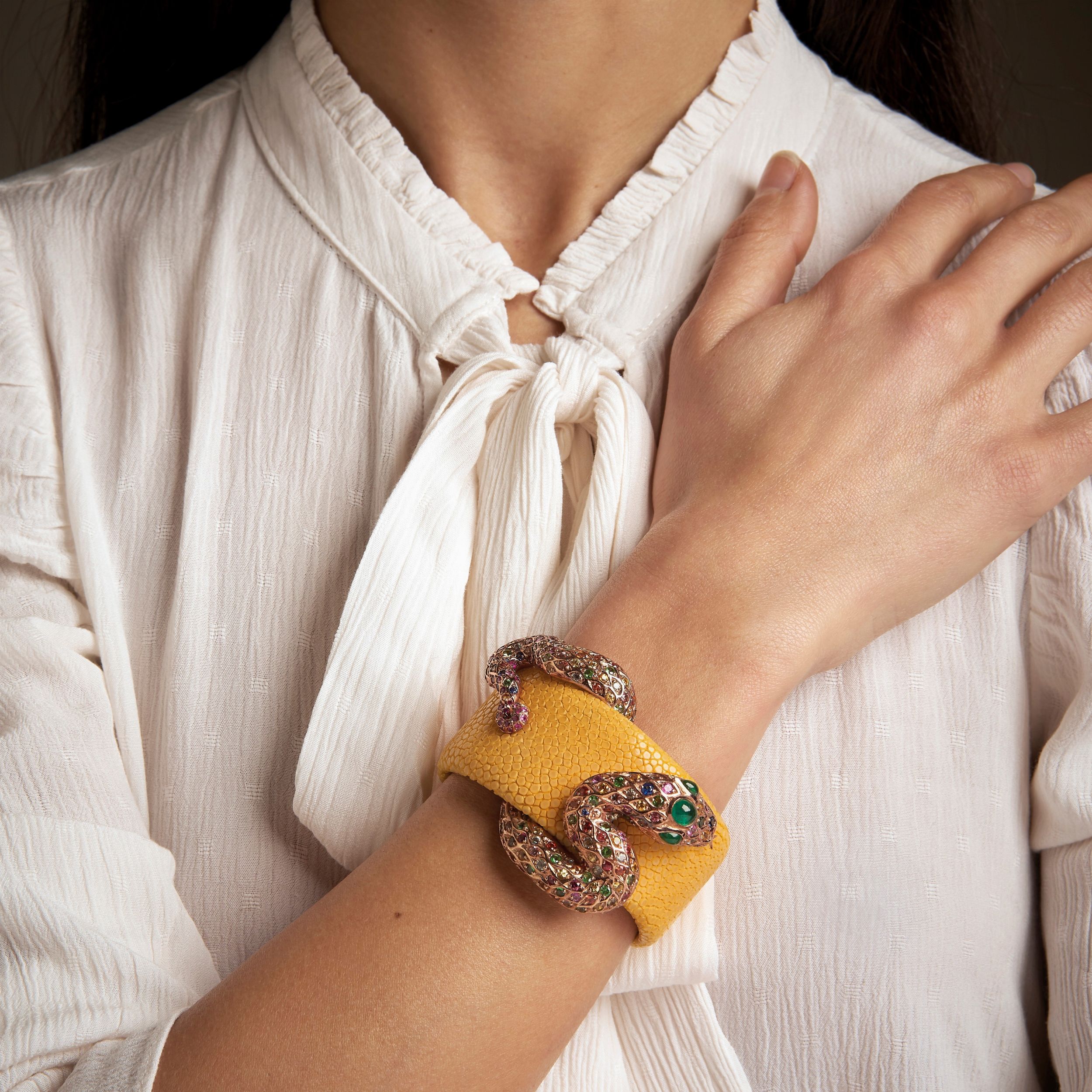 a schiava in razza galuchat con serpente impreziosito da pietre colorate taglio rotondo e smeraldi taglio ovale e goccia cabochon.