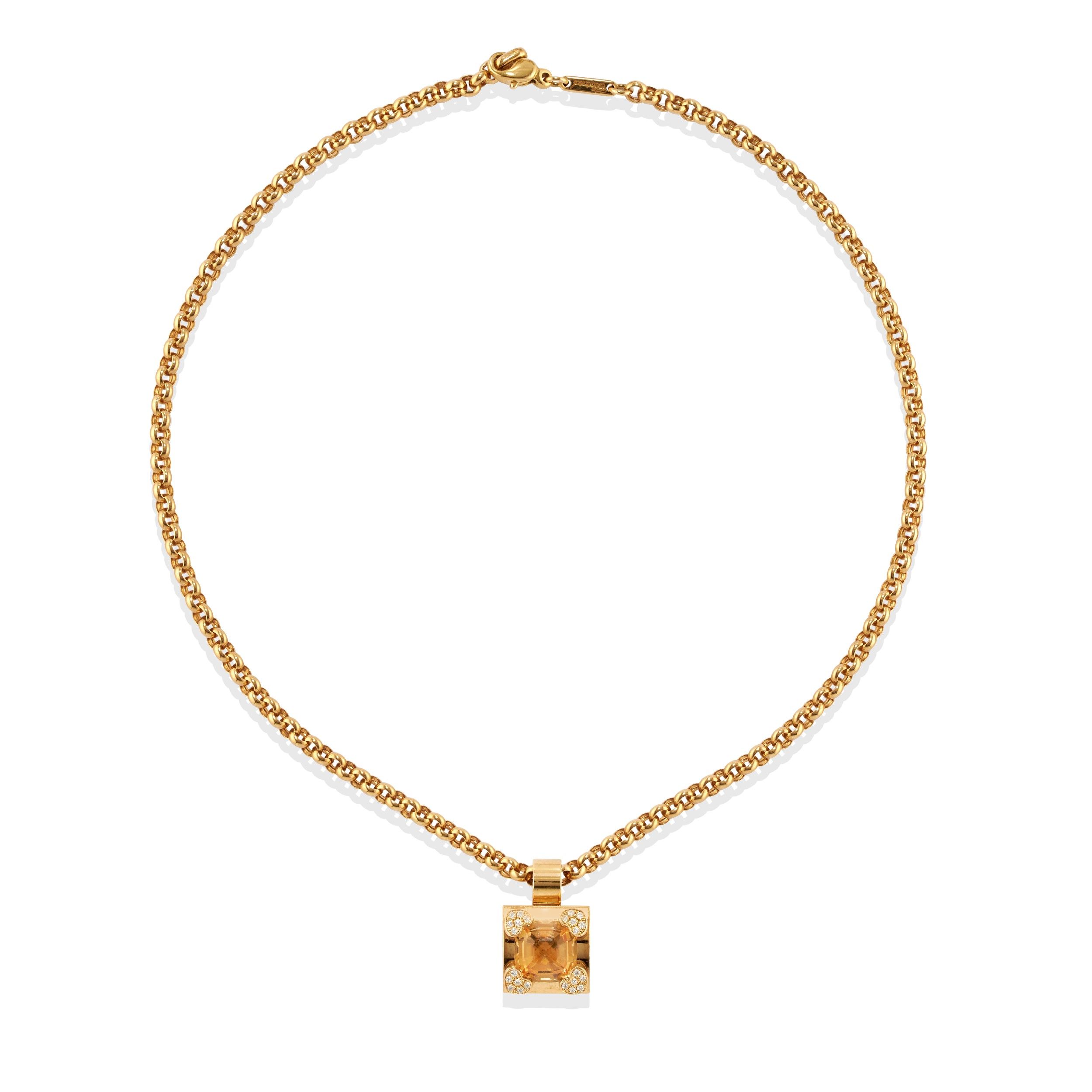 maglia ad anelli con pendente scorrevole centrato da quarzo citrino taglio cuscino, motivi a cuore in diamanti taglio brillante.