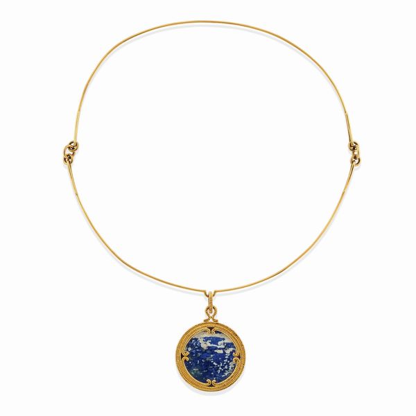 in filo d'oro liscio con pendente in pietra dura blu e bianca.