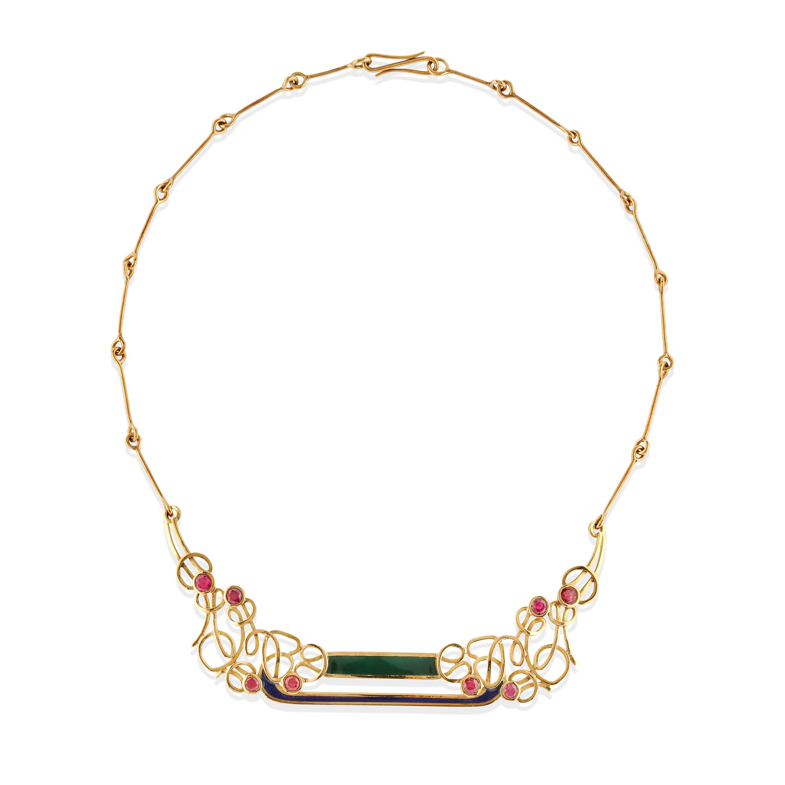 rubini taglio rotondo, al centro decoro con smalto blu e verde.