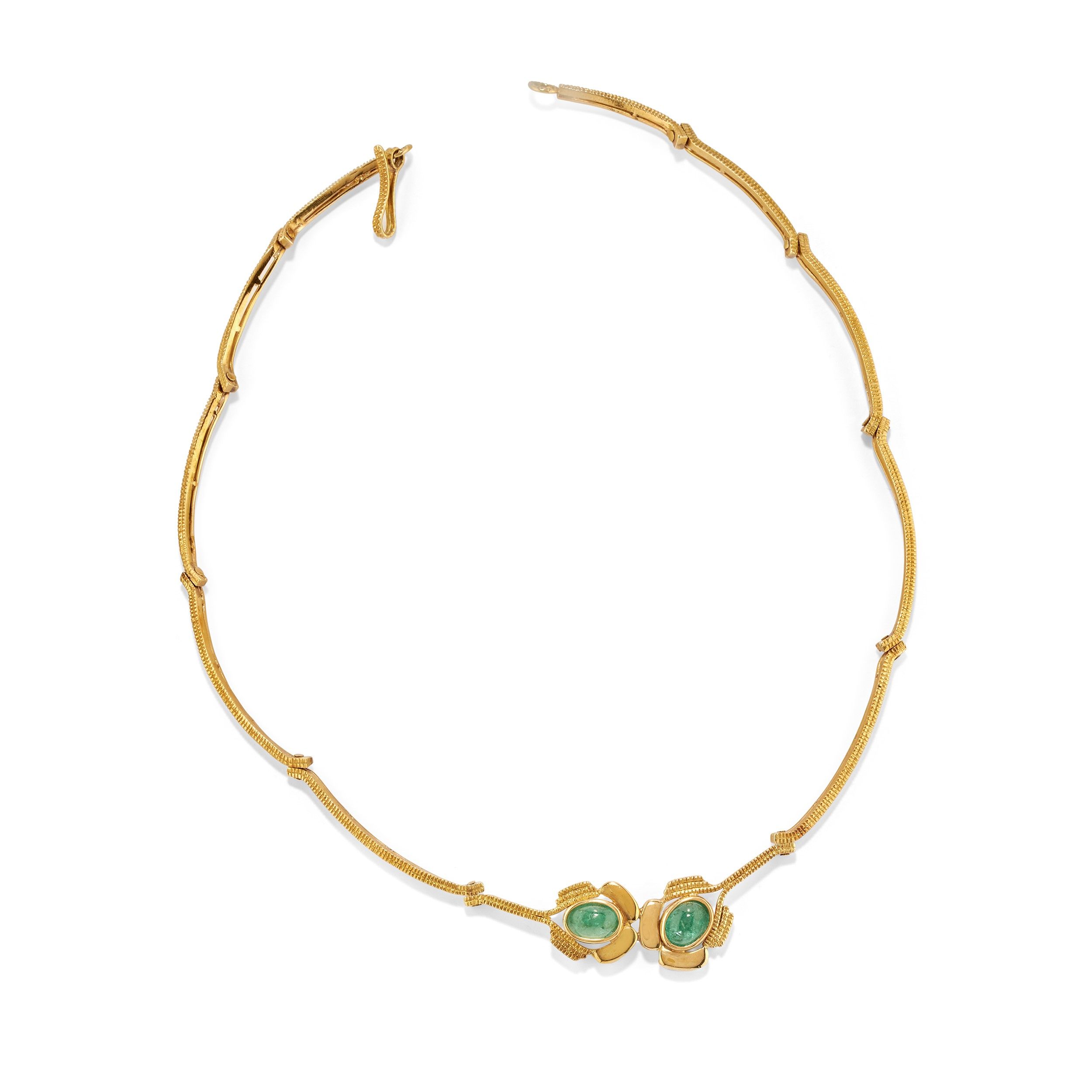 realizzata con decoro martellato, al centro smeraldi taglio ovale cabochon.