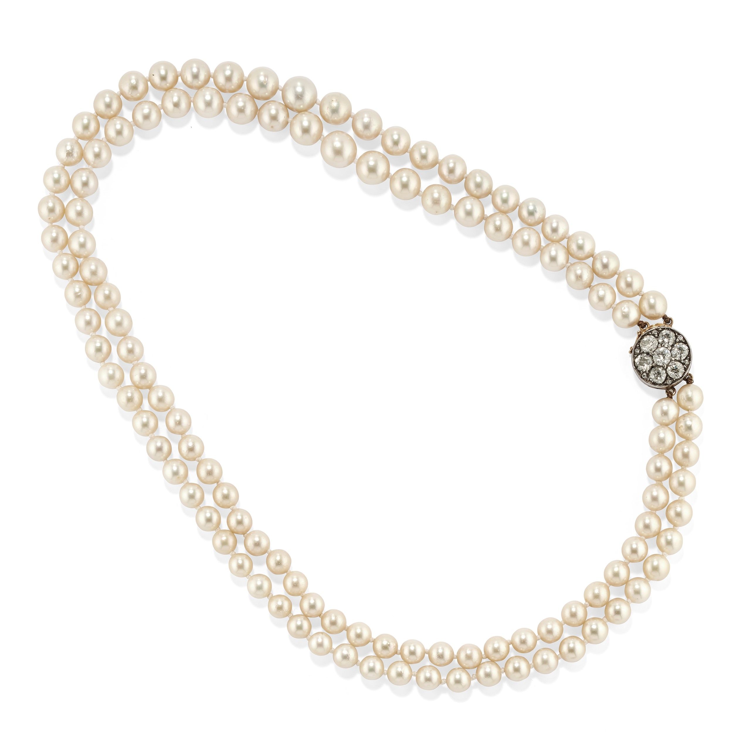a due fili di perle coltivate disposte a degradé dal centro di mm 10,00/7,50, chiusura a fiore con diamanti taglio vecchio per totale ct 3,00 circa.