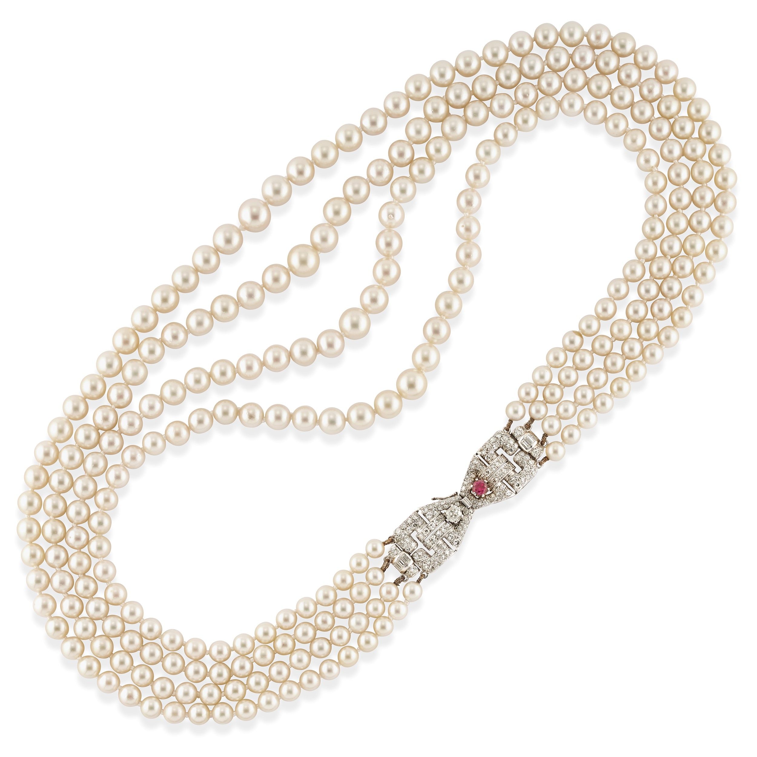 a quattro fili di perle coltivate, disposte a degradè dal centro di mm 9,00/6,00, con chiusura impreziosita da diamanti taglio vecchio e huit-huit e da rubino taglio rotondo.