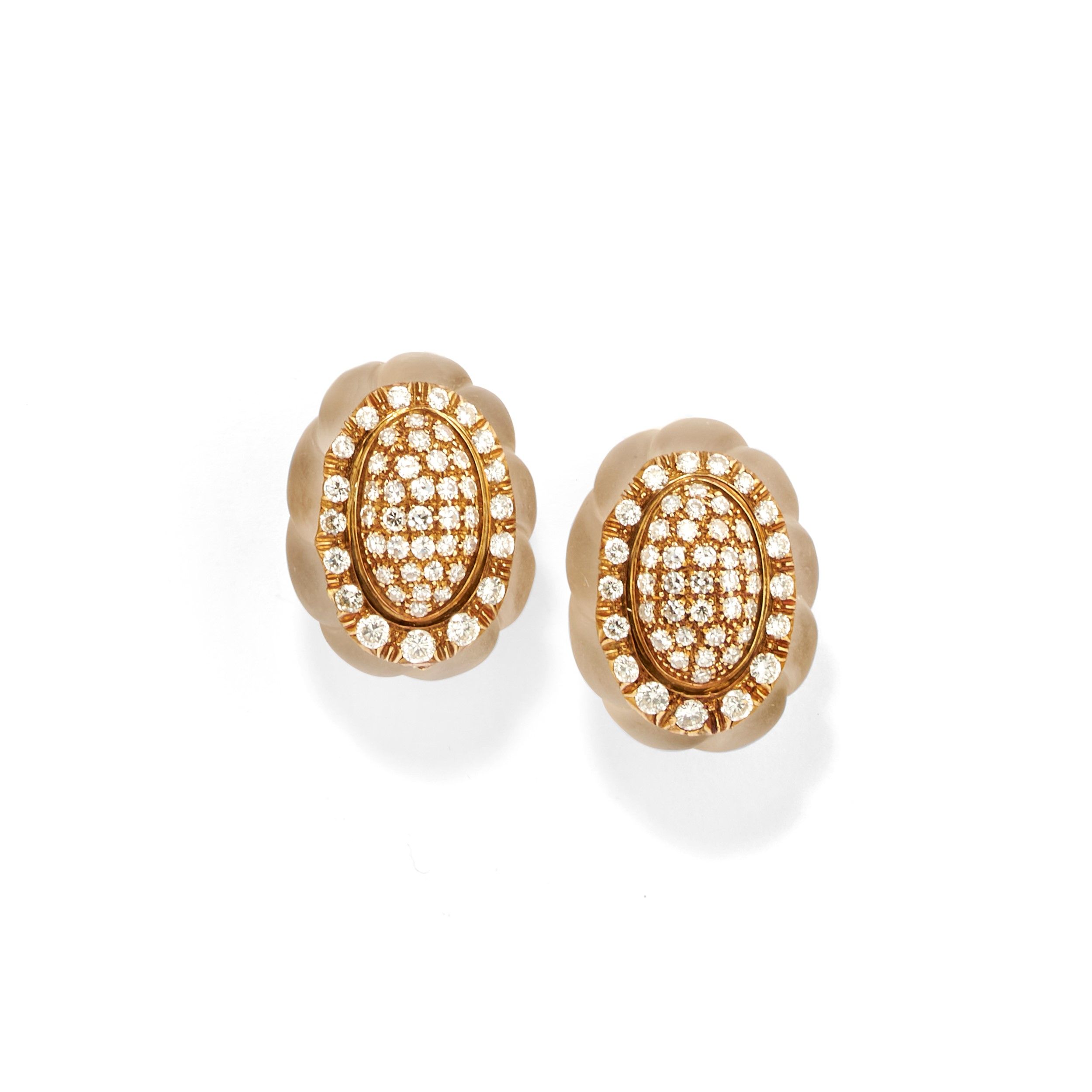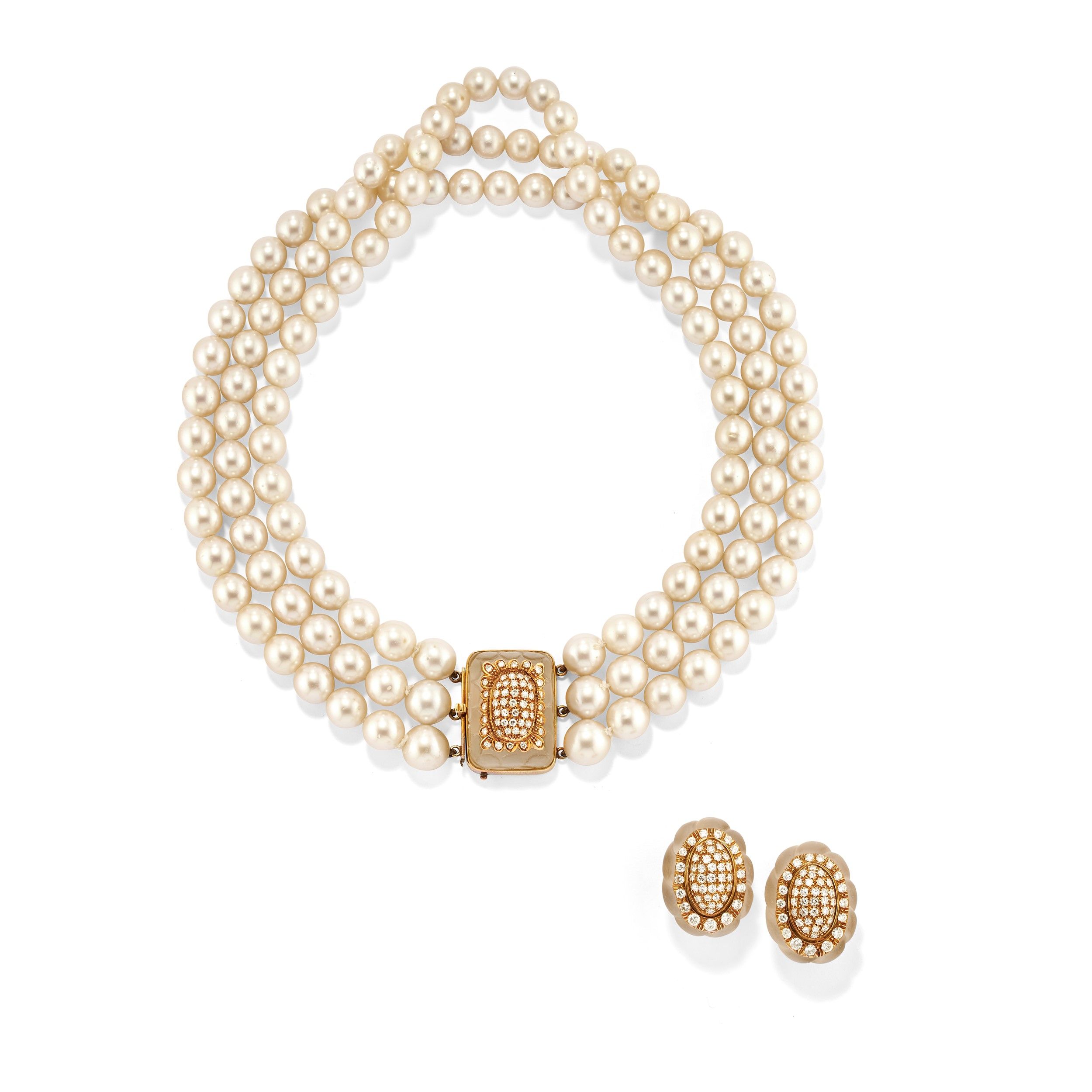 composta da collana a tre fili di perle coltivate di mm 8,50/10,00 circa e coppia di orecchini con chiusura a clip, inserti in cristallo di rocca sabbiato ed inciso, decoro in diamanti taglio brillante e huit-huit per totale ct 3,00 circa.