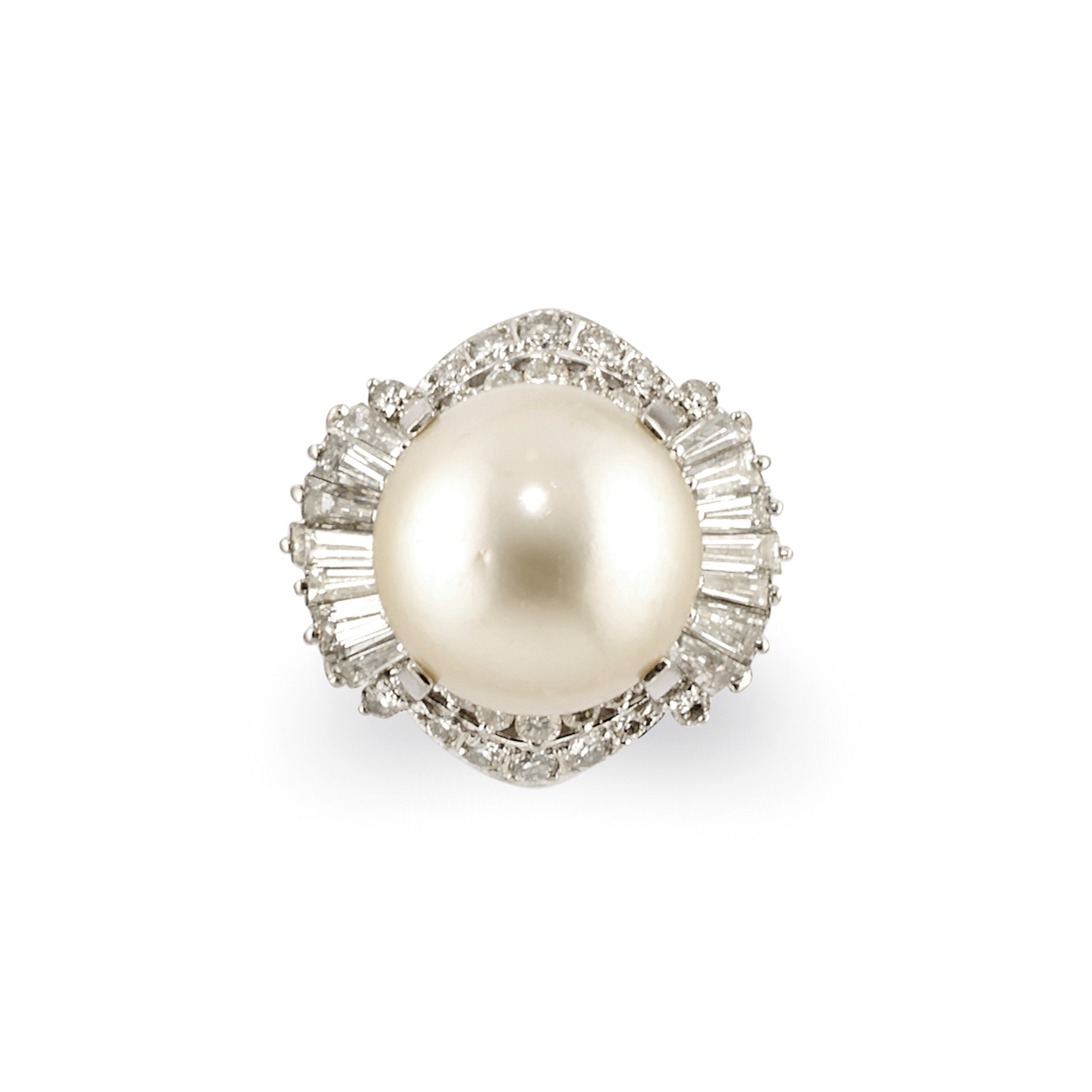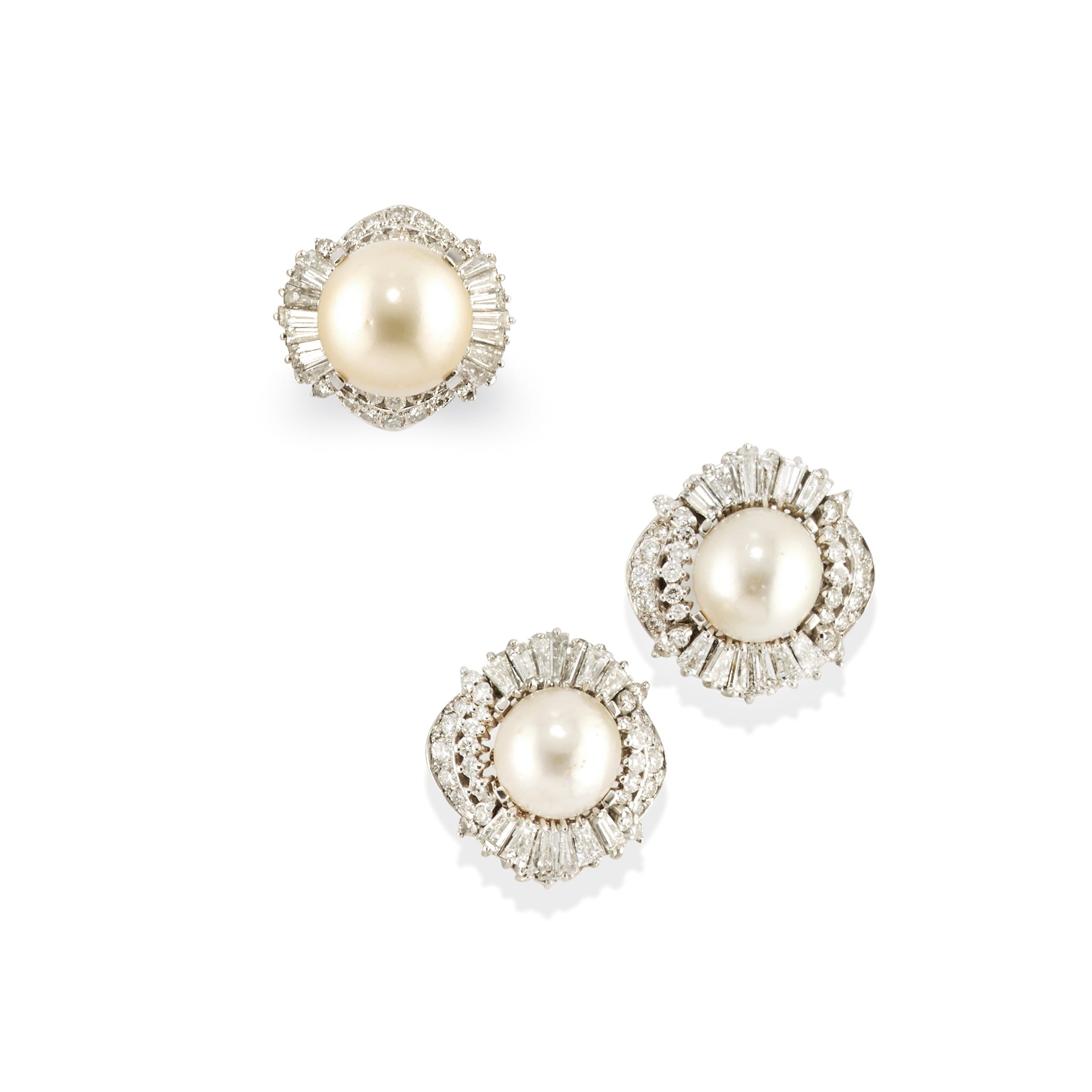 composta da anello e coppia di orecchini con chiusura perno, clip e farfalla, perle coltivate South-Sea di mm 12,00-15,00 circa, diamanti taglio brillante e tapered baguette per totale ct 6,00 circa.