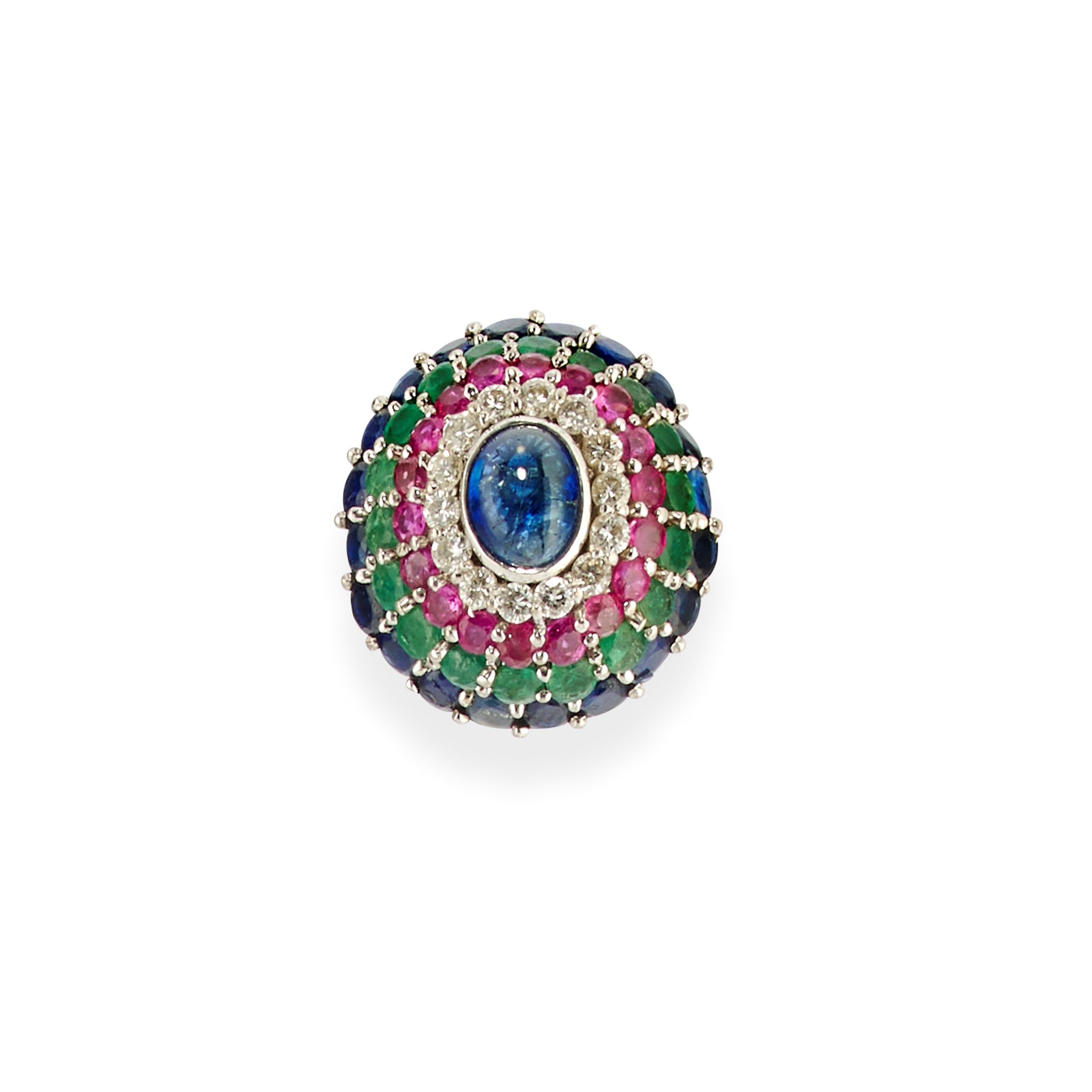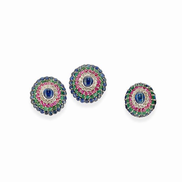 composta da anello e coppia di orecchini con chiusura a clip, al centro zaffiri taglio ovale cabochon entro cornice in diamanti taglio brillante, rubini, smeraldi e zaffiri taglio rotondo.