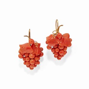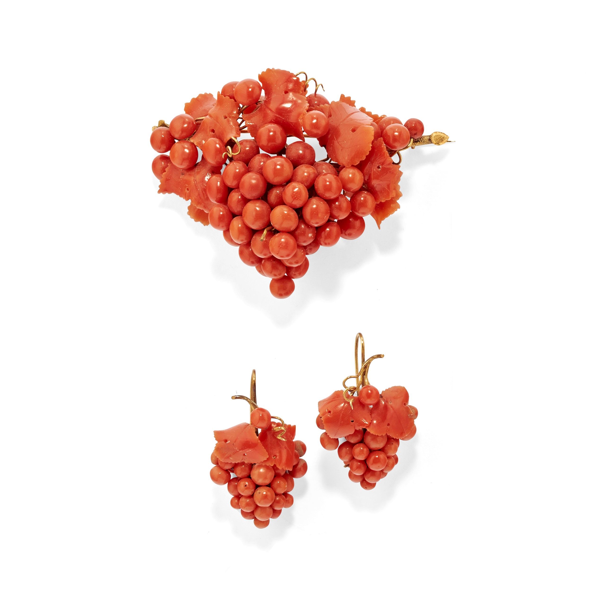 composta da spilla e coppia di orecchini con chiusura a monachella, inserti a foglie di vite e grappoli d'uva, difetti (alcuni inserti mancanti), con astuccio.