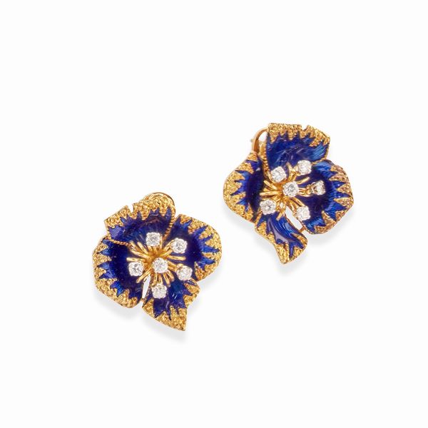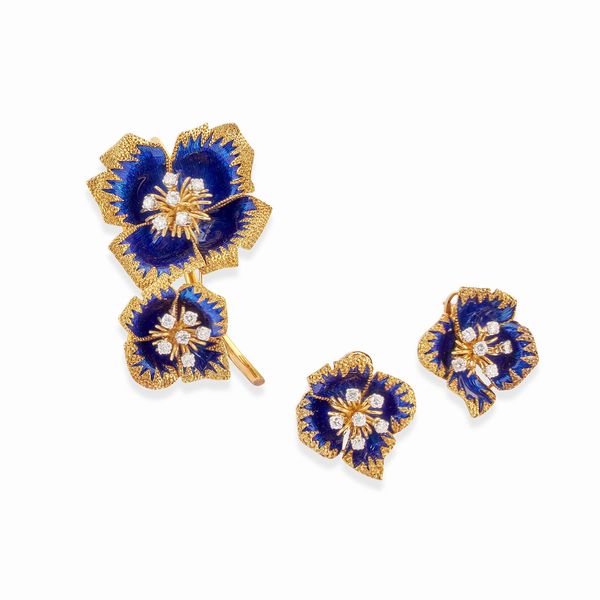 di gusto floreale composta da spilla e coppia di orecchini con chiusura a perno e clip, smalto blu, diamanti taglio brillante per totale ct 1,50 circa.