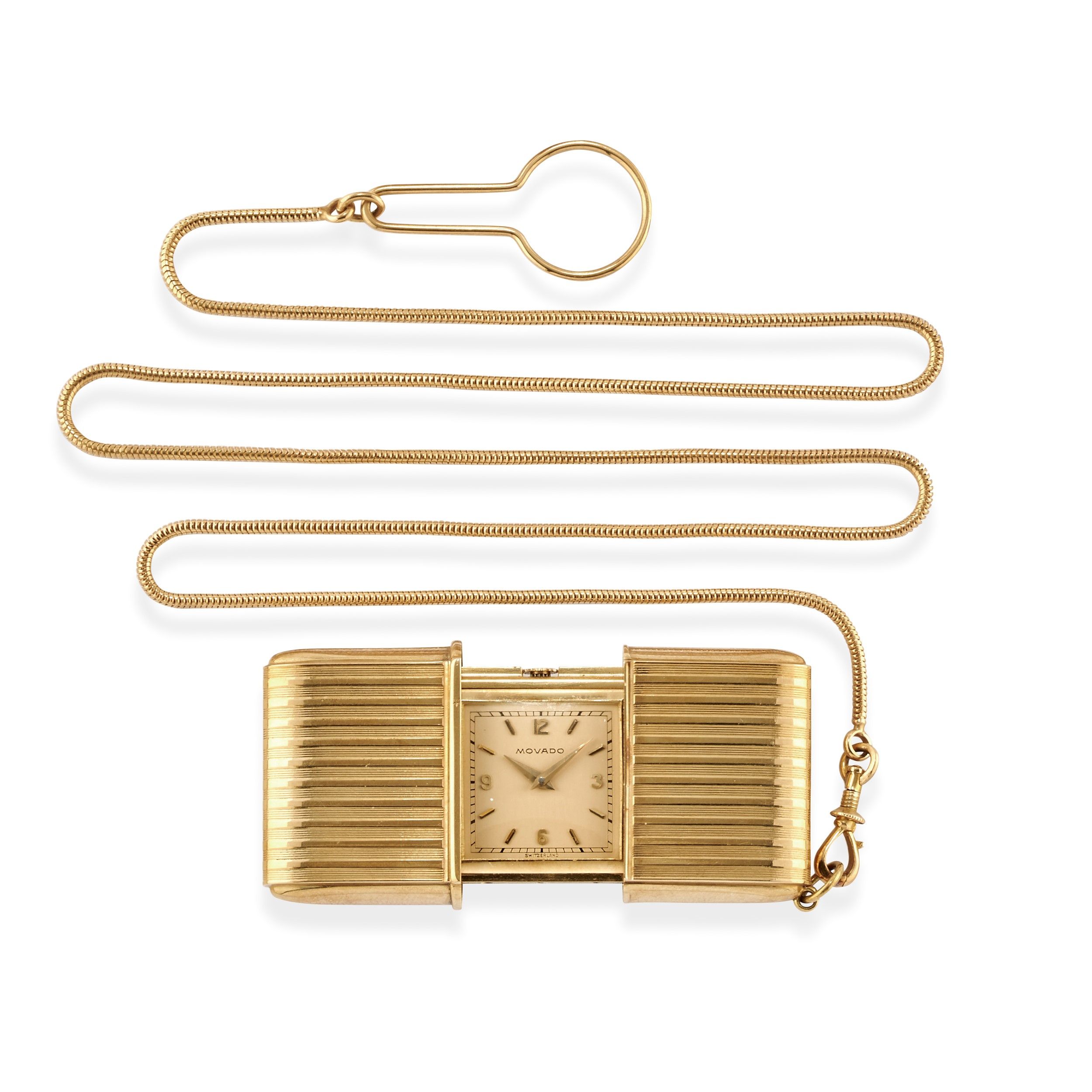 cassa quadrata, quadrante chiaro con indici e numeri arabi applicati, movimento a carica manuale, con catena queue de rat.