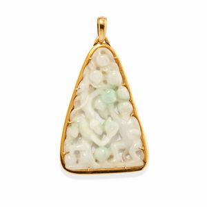 in oro giallo 18k, Peso g 28,40 cm 4,40x9,00 di forma triangolare, con inserto in giadeite traforato.