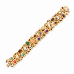 in oro giallo 14k, Peso g 81,70 cm 2,00x17,50 con inserti in pietre dure colorate e cammei con profili femmini [..]