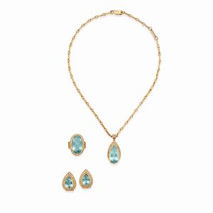 in oro bicolore 18k, Peso g 74,50 cm 19,00-1,80x2,60-40,00 composta da collana, anello e coppia di orecchini con [..]