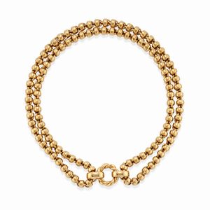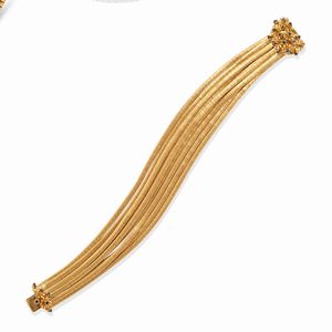 in oro giallo 18k, Peso g 145,80 collana cm 77,00 bracciali cm 19,50 con maglie a barilotto, centrale estraibile [..]
