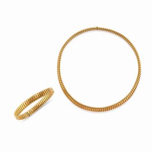 in oro giallo 18k, Peso g 64,35 cm 19,00-40,00 composta da bracciale e collana, maglia a tubogas piatta leggermente [..]