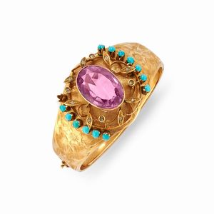 in oro giallo 18k, Peso g 45,80 diametro interno cm 6,00 XIX secolo al centro ametista taglio ovale, ai lati [..]