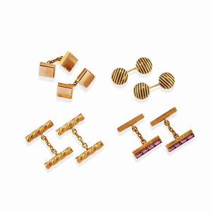 in oro giallo 18k e bassa caratura, Peso g 38,50 cm 3,00-2,00x6,00 uno di forma rotonda con decoro in smalto policromo [..]