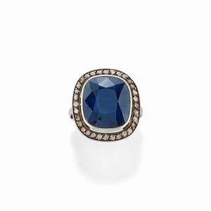 in argento, Peso g 7,50 misura 11 al centro grande zaffiro Australia taglio cuscino entro cornice in diamanti [..]
