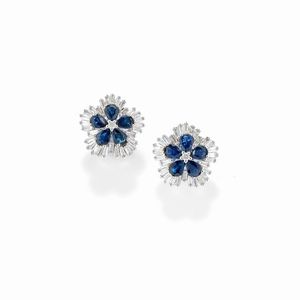 in oro bianco 18k, Peso g 4,40 cm 1,50 a fiore, con zaffiri taglio goccia per totale ct 2,00 circa e diamanti [..]