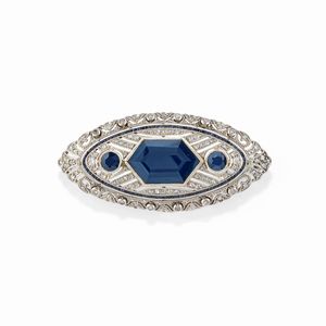 in platino e oro giallo 18k, Peso g 14,10 cm 2,50x5,40 1920 circa a saponetta traforata, con zaffiro taglio esagonale, [..]