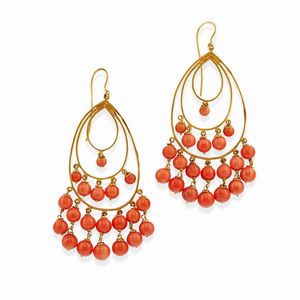 in oro giallo 14k, Peso g 36,90 cm 4,00x9,00 motivi a goccia con boule di corallo su perno oscillante, chiusura [..]