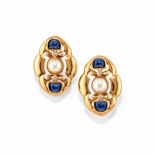 in oro giallo 18k, Peso g 30,10 cm 2,90x4,00 a scudo con zaffiri cabochon taglio fantasia, perle coltivate e diamanti [..]