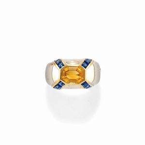 in oro bicolore 18k, Peso g 13,50 misura 13 montatura bombata centrata da zaffiro giallo taglio ottagonale di [..]