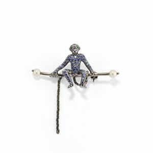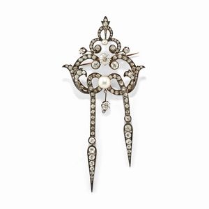 in argento e oro giallo 18k, Peso g 31,00 cm 5,50x11,40 XIX secolo ad eleganti volute con due motivi oscillanti [..]