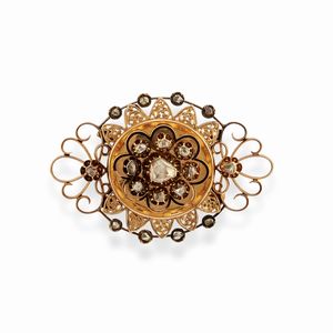 in oro giallo 18k, Peso g 17,00 cm 3,70x5,40 inizi XX secolo centrale a fiore con diamanti taglio rosa e smalto, [..]