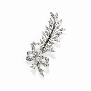 in oro bianco 18k, Peso g 24,20 cm 4,00x5,00 1950 circa a fiocco nastrato con motivo a raggiera, diamanti taglio [..]