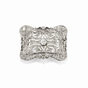 in oro bianco 18k, Peso g 19,40 cm 3,30x4,50 interamente traforata decorata da diamanti taglio brillante, vecchio [..]