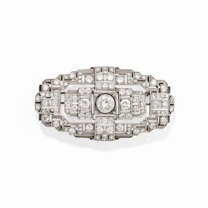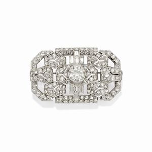 in platino, Peso g 19,60 cm 3,00x5,00 1930 circa al centro un diamante taglio vecchio di ct 3,00 circa, diamanti [..]