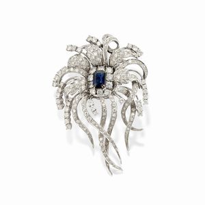 in oro bianco 18k, Peso g 32,20 cm 5,00x7,00 di gusto floreale con al centro zaffiro taglio rettangolare a contorno [..]