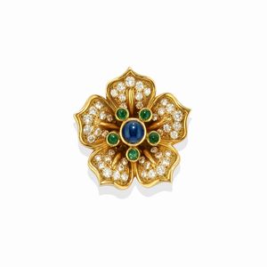 in oro giallo 14k, Peso g 11,25 cm 2,50x2,50 a fiore, zaffiro e smeraldo taglio rotondo cabochon, diamanti taglio [..]