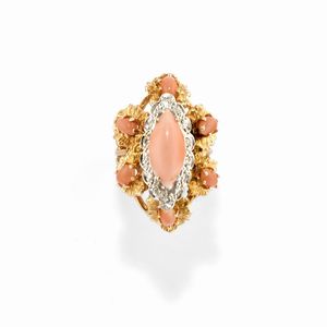 in oro giallo 14k, Peso g 10,00 misura 12 sommità stilizzata, corallo rosa taglio ovale e navette cabochon, diamanti [..]