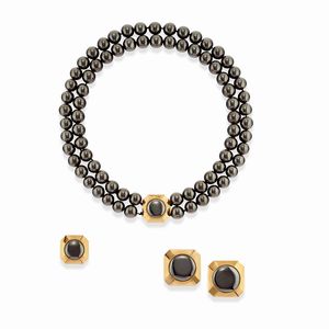 in oro giallo 18k, Peso g 416,00 cm 3,20x3,20-46,00 misura 19 composta da collana, anello e coppia di orecchini [..]