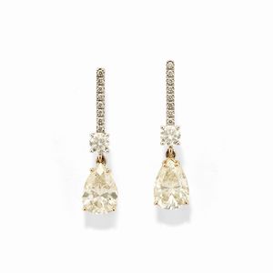 in oro bicolore 18k, Peso g 21,40 cm 2,50x5,50 parte superiore a voluta da cui diparte motivo a goccia, diamanti [..]
