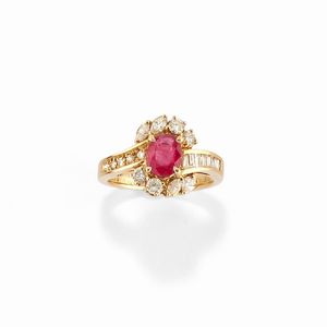 in oro bicolore 18k, Peso g 11,85 misura 13 a fascia con al centro rubino taglio ovale di ct 0,50 circa, e diamanti [..]