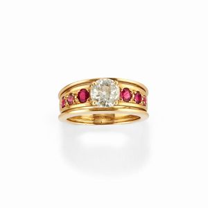in oro giallo 18k, Peso g 7,40 misura 12 a fascia con rubini taglio rotondo ed al centro diamante taglio vecchio [..]