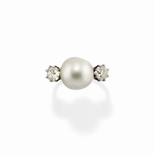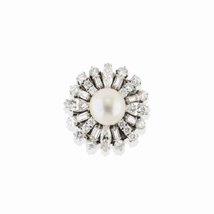 in argento e oro bassa caratura, Peso g 19,25 cm 4,80x5,20 al centro perla naturale di acqua salata, diamanti [..]
