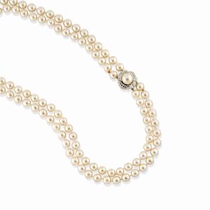 in oro bianco 18k, Peso g 158,90 cm 61,00 a due fili di perle coltivate di mm 9,00/9,50 circa con chiusura centrata [..]