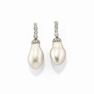 in oro bianco 18k, Peso g 10,15 cm 3,50 diamanti taglio brillante per totale ct 0,80 circa, perle coltivate barocche, [..]