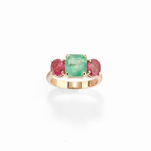 in oro rosa 18k, Peso g 6,22 misura 13 al centro smeraldo taglio rettangolare a contorno ottagonale di ct 2,40 [..]