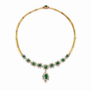 in oro giallo 18k, Peso g 138,00 cm 48,00 al centro motivi a fiore con smeraldi taglio rotondo per totale ct 7,00 [..]